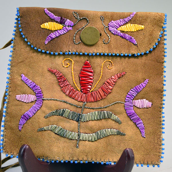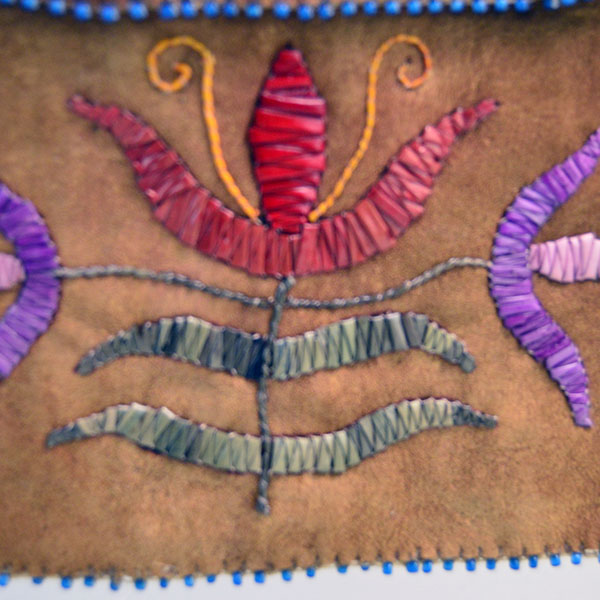 A bag made from Braintanned hide and adorned with quillwork represents a convergence of function, artistry, and tradition. These bags were used to carry personal items, medicines, or sacred objects, and their designs often conveyed tribal affiliations, stories, or spiritual beliefs. The floral motifs—especially those in vibrant colors like red, yellow, and purple—were common and symbolized growth, harmony, and connection to nature.