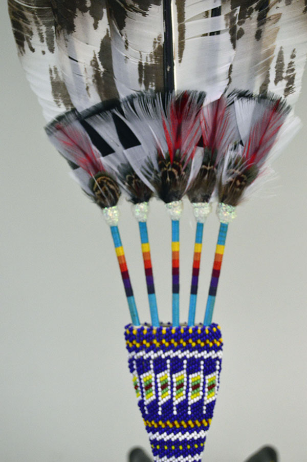 SOLD Delight in the vibrant colors and sparkling cut seed beads on this striking flat fan with hand-painted feathers! The artist crafted this fan using beautifully detailed turkey feathers, hand-painted to resemble majestic eagle feathers. The handle showcases a dazzling peyote stitch design, created with shimmering cut seed beads that sparkle far more than the photograph can capture.Set against a Royal Blue background, the artist used peyote stitch to weave bold geometric patterns in bright primary colors—royal blue, green, yellow, white, and red. At the base of the handle, 6 inches of fine twisted white deerskin leather fringe adds elegant movement and texture.