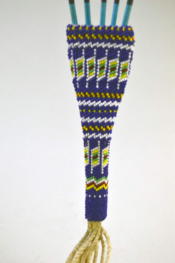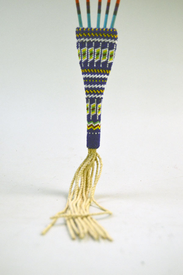 The beaded handle measures 5 inches long and 1.5 inches wide. Including the fringe, the entire fan spans 23 inches in length.