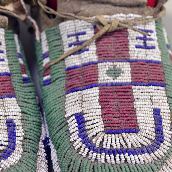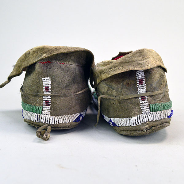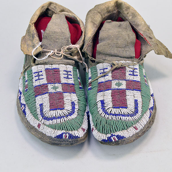 These Fully Beaded Blue Moccasins are new and have never been worn. The crafter used 10/0 seed beads in light blue for the background and red, orange yellow, and white to make the diamond designs. The tongues have a strip of beading in blue, red, orange, yellow and white and the cuffs are lined with blue beads. The moccasins and laces are made of white deerskin leather and have hard leather soles.These moccasins measure 10 inches long from heal to toe. The widest part of the sole measures 3.75 inches and the heel measures 2.75 inches.