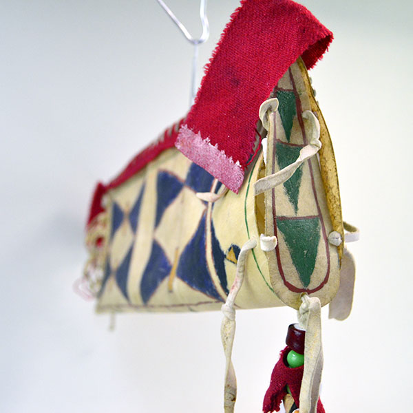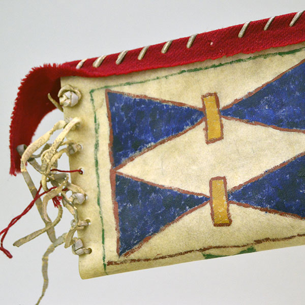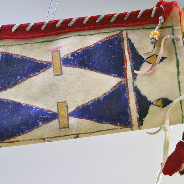 SOLD Add this brightly painted rawhide container to your collection! The artisan adorned it with bold geometric designs in red, blue, yellow, and green, creating a vibrant visual statement. It opens at the top and measures approximately 16" long by 5.5" wide. Crafted with care, the container features Braintanned deerskin leather lacing ties for secure closure. The maker also embellished it with trade beads, bone hairpipe, brass beads, and a striking accent of red wool. This piece is in very good condition and showcases skillful painting and thoughtful detail—an eye-catching blend of tradition and artistry.One of a Kind!
