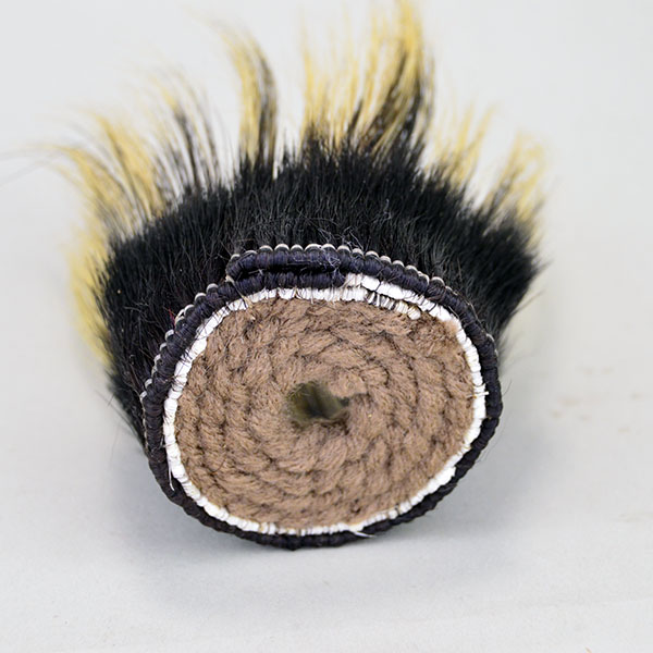 SOLD This Roach – Eastern Round Style is a striking example of traditional Native American headwear. Master craftsman Andy Bullock brings exceptional skill to its creation. It features a hand-braided round yarn base measuring approximately 2.5″ in diameter. For the outer row, Andy used black bear fur and for the inner row he used traditional 6″ long porcupine hair. This roach honors cultural heritage through its materials and construction. These Roaches attach to your head with a small hair braid (or scalplock) pulled though the center hole and fastened with a roach pin.One of a Kind. The Eastern Round Style roach has a long history as traditional male headwear. Dancers wear them in ceremonial dance and cultural gatherings. Unlike linear Mohawk-style roaches, the rounded design reflects regional aesthetics and spiritual symbolism. It echoes cycles of life and community. Over time, this style became a key part of powwow regalia and historical reenactments. It preserves ancestral craftsmanship while adapting to modern expressions of identity and pride.