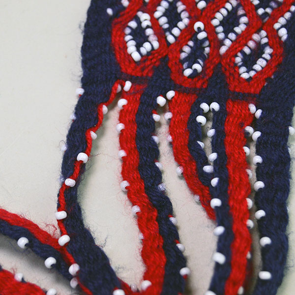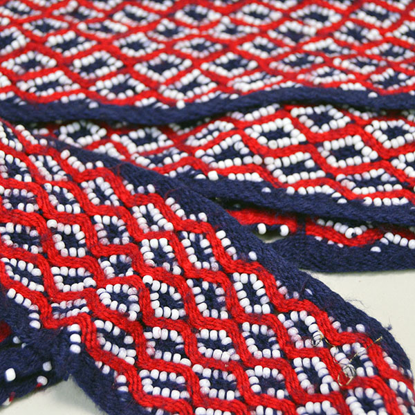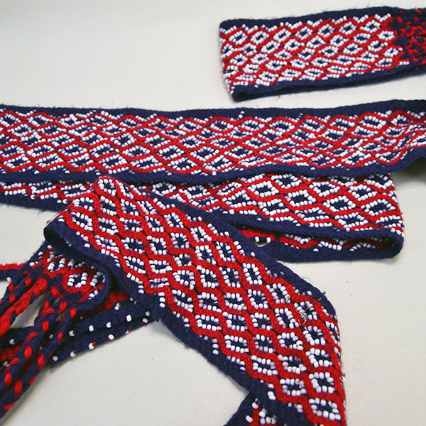 The Seminole-style garter and belt originate from the rich tradition of Southeastern Indigenous textile artistry, where artisans use finger weaving, beadwork, and symbolic color choices to shape ceremonial and everyday dress. During the 18th and 19th centuries, Seminole men prominently wore beaded sashes and belts crafted from wool and embellished with chevron patterns and delicate seed beads.