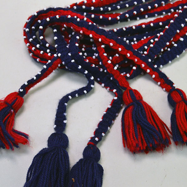 SOLD This Seminole style Garter & Belt set showcases vibrant craftsmanship, finger-woven from rich red and navy blue yarn. Both the garters and belt feature elaborate beadwork, adding depth and ceremonial elegance. Braided tassels extend from the belt, each carefully outlined with white 10/0 seed beads. The combination of bold colors, traditional weaving techniques, and detailed embellishments reflects the artistry and cultural significance of Seminole regalia.Garters: 13" long by 2 .75" wide, Tassels measure 13" long.