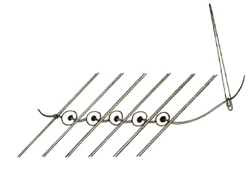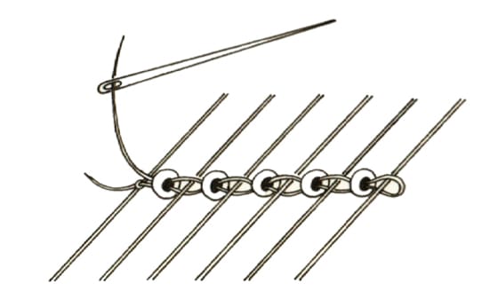 Thread your needle with about 2 feet of thread and tie the end to the outer warp thread. Use your needle to pick up the beads for each row. Bring the thread with the beads under the warp thread and push them up between the threads, positioning one bead in each space. Next, pass the needle back through the beads on top of the warp threads in the opposite direction. This time your needle and thread should pass ABOVE the warp thread. Pull the thread snug so your beads are drawn close together. When you are out of thread, tie a new strand to the same outer warp thread. Thread your needle again and continue your project.