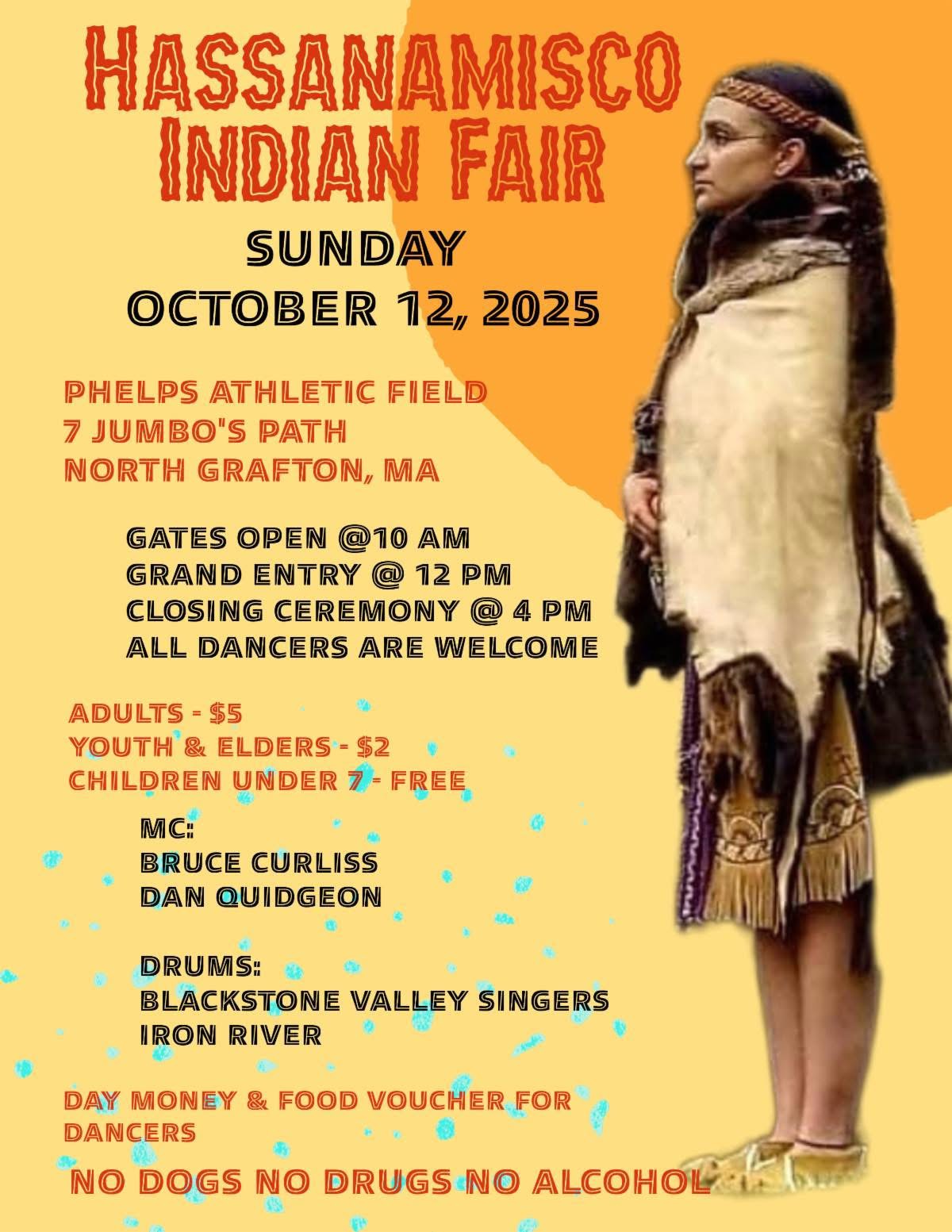 2 events found. Events Search and Views Navigation Search Enter Keyword. Search for Events by Keyword. Find Events Event Views Navigation Photo List Month Day Photo Week Today Upcoming Upcoming Select date. List of events in Photo View Hassanamisco Indian Fair Oct 12 All day Hassanamisco Indian Fair $2 – $5 The Four Winds Singers “Get out of Cold” Winter Powwow Feb 7 10:00 am - 6:00 pm The Four Winds Singers “Get out of Cold” Winter Powwow Previous Events Today Next Events Subscribe to calendar Google Calendar iCalendar Outlook 365 Outlook Live Export .ics file Export Outlook .ics file