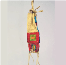 Antique clothing and accessories will have wear in the right places for that specific piece. Older leather becomes fragile with age. Many items will have bug damage on fabrics such as wool. Paint on rawhide will have fading and will have rubbed off in the places it would have been handled. Any quill work on the material will have a matte look to it and a worn or dusty look in between the quills. You can look at the stitching of a piece as well – if it was made with real or imitation sinew.