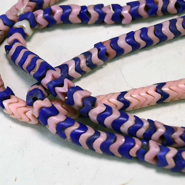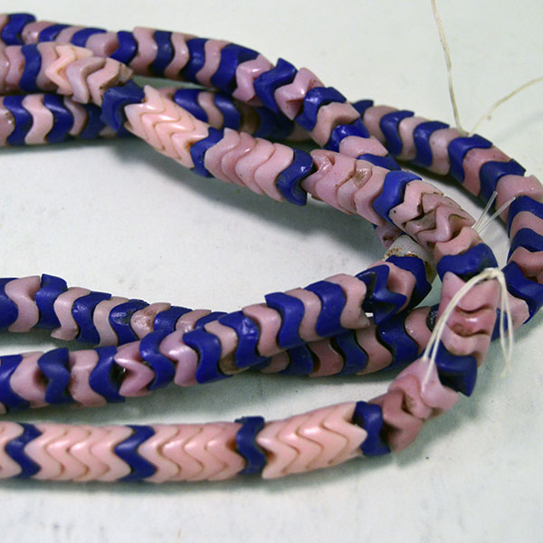 Add these Antique Trade Beads Snake Beads- 3 strands to your collection. They call them Snake beads because of the way they interlock like a snake’s backbone. Zig-zag in shape, these beads are like little puzzle pieces. These beads are in very good condition with minimal wear, you will notice some dirt and minor chips due to their age. You will receive three 24 inch long strands with an assortment of rose and cobalt blue colors. They measure approximately 8mm wide with varying thicknesses. You will get about 600 beads altogether.