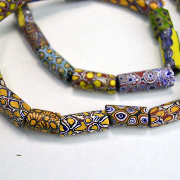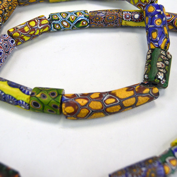 Venetian Millefiori Beads are one of several types of beads that we call Trade Beads. European traders often brought these beads to Africa, but they made their way to the Americas as well. Factories in Venice produced these beads beginning in the early 1800s. Artisans used canes of glass to create flowers and stripe designs. Then they molded layers of these designs around a core of solid colored glass. They then cut or broke these glass rods into beads. The result is a colorful mix of designs called Venetian Millefiori beads. Millefiori means “thousand flowers” in Italian.