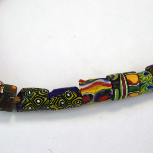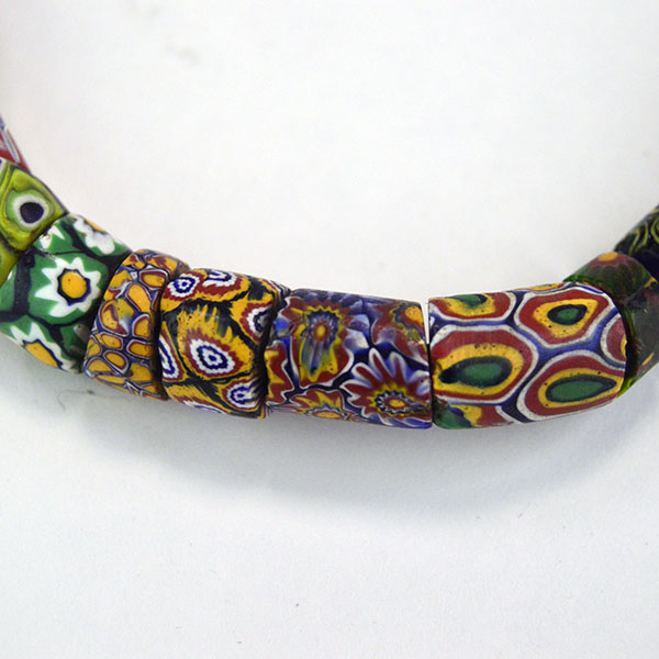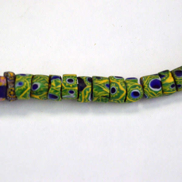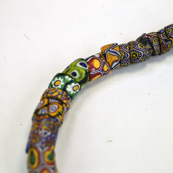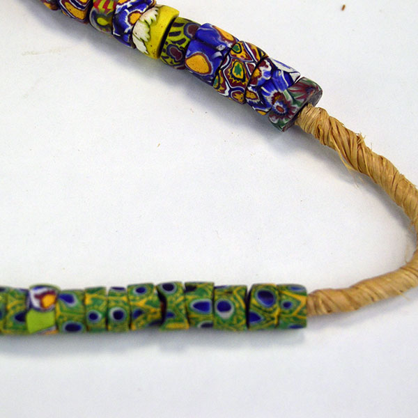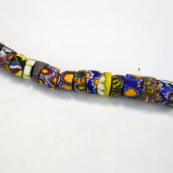Venetian Millefiori Beads are one of several types of beads that we call Trade Beads. European traders often brought these beads to Africa, but they made their way to the Americas as well. Factories in Venice produced these beads beginning in the early 1800s. Artisans used canes of glass to create flowers and stripe designs. Then they molded layers of these designs around a core of solid colored glass. They then cut or broke these glass rods into beads. The result is a colorful mix of designs called Venetian Millefiori beads. Millefiori means “thousand flowers” in Italian.