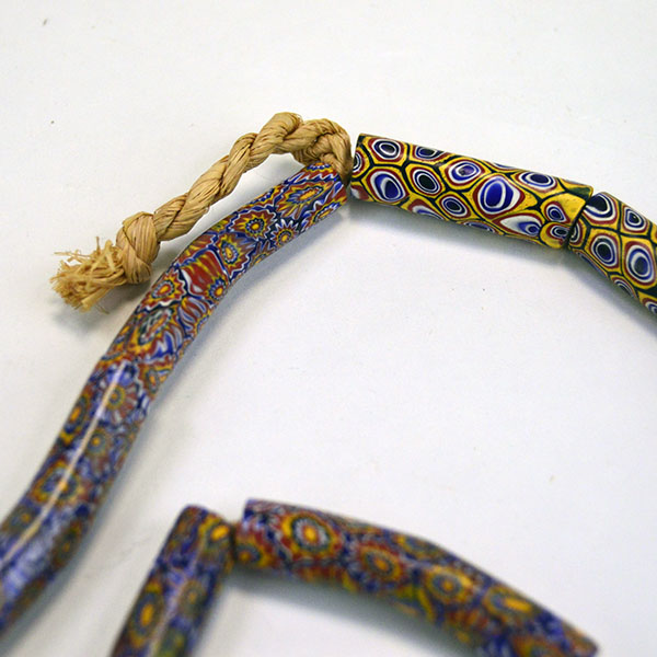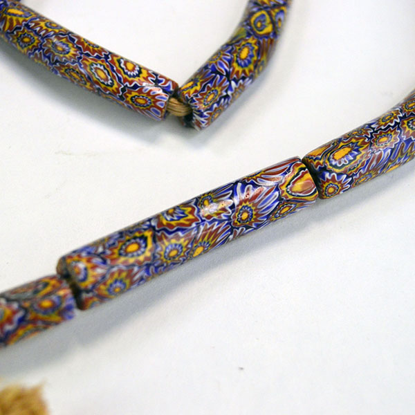 Venetian Millefiori Beads are one of several types of beads that we call Trade Beads. European traders often brought these beads to Africa, but they made their way to the Americas as well. Factories in Venice produced these beads beginning in the early 1800s. Artisans used canes of glass to create flowers and stripe designs. Then they molded layers of these designs around a core of solid colored glass. They then cut or broke these glass rods into beads. The result is a colorful mix of designs called Venetian Millefiori beads. Millefiori means “thousand flowers” in Italian.