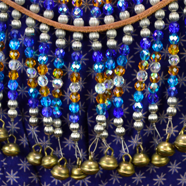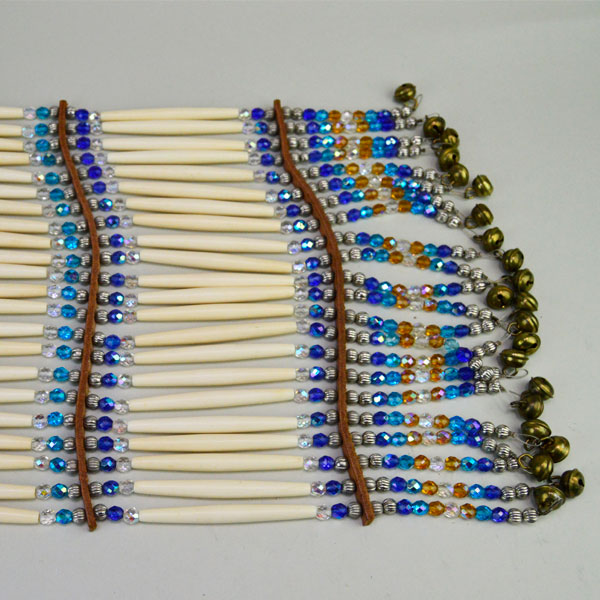 Wear either of these with the Southern Plains style Breastplate. The crafter made it with 1.5 inch plastic hairpipe and 3.5 inch Bone hairpipe. He strung these with Amber, Turquoise, Royal Blue and Clear Fire Polish Beads and fluted hollow Nickel Beads. At the bottom, the crafter added Hawk Bells.