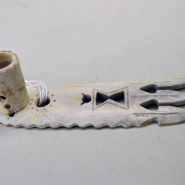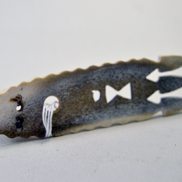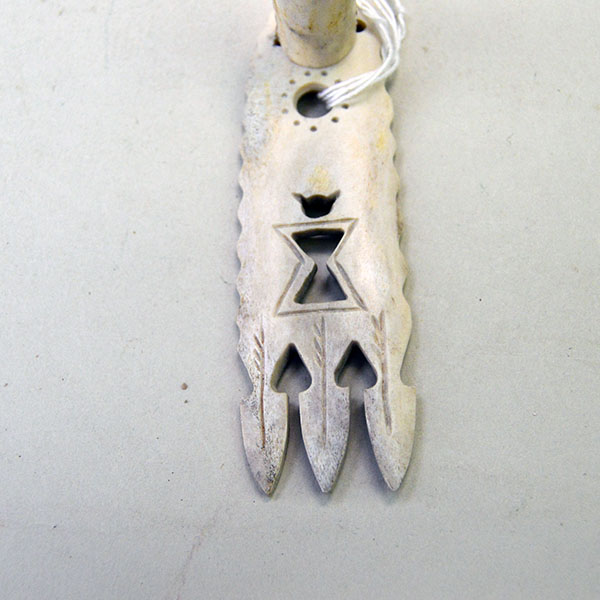 Use this hand carved Spreader- Caribou Bone 4″ at your next event or add it to your collection of accessories! The artist carved this Roach Spreader from natural Caribou Antler. He carved circle and triangular designs on the top. Next he added etched designs including three arrows, a horned figure around the triangular cutouts and dots around the cutout circle. Finally he carved the edge of the spreader in a wavy design.