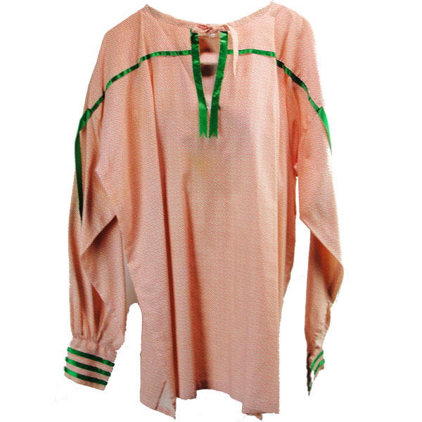 Discover the beauty of tradition with this Ribbon Shirt – Coral and Green, crafted from a coral cotton blend and accented with green silk ribbon trim across the front, sleeves, and back. This one‑of‑a‑kind piece comes with a three‑piece silk scarf set in green, featuring embroidered yellow star patches for a cohesive, elegant look. A previous owner wore this shirt, you will notice a few stains, but it is still in good wearable condition.