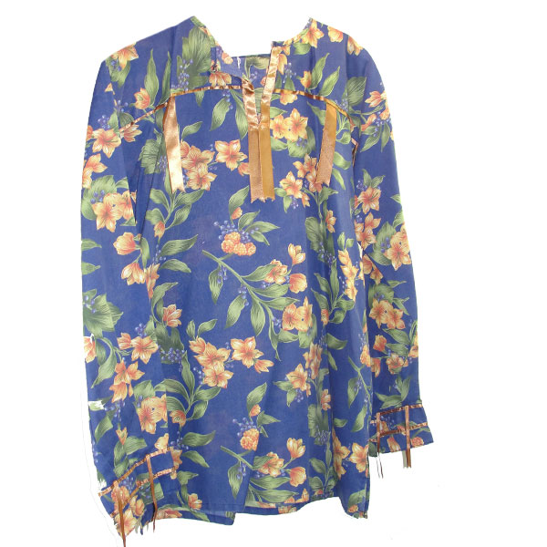 This Ribbon Shirt- Flowers Royal blue cotton blend features bronze silk ribbon trim on the front, the sleeves and back. This Ribbon shirt comes with a three piece silk Scarf Set in Gold with embroidered pink flower patches. The cuffs have Velcro fasteners. This shirt comes in a loose, pull over style with an open V-neck with a small clasp.