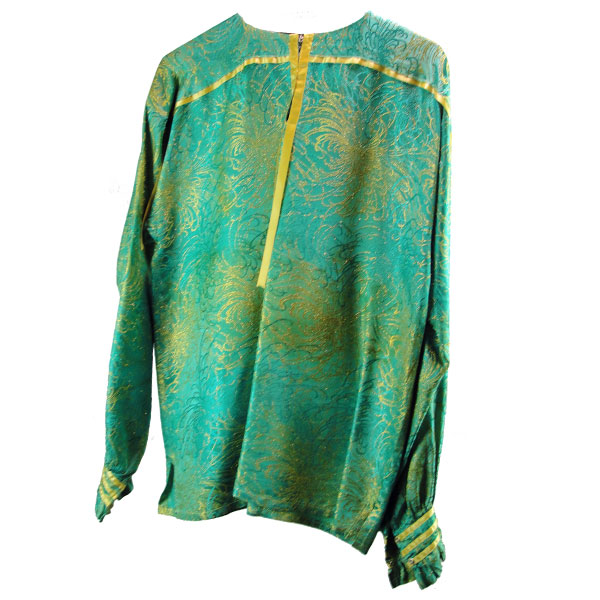 The shirt measures approximately 30 inches long and 24 inches wide (lying flat). There is a 6.5 inch wide neck opening (lying flat). The sleeves measure 25 inches long. The wrist measures 4 inches wide lying flat. A previous owner wore this shirt, you will notice a few stains, but it is still in good wearable condition. One of a Kind!