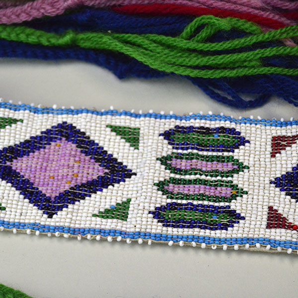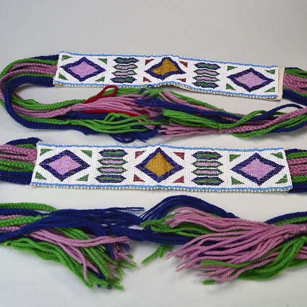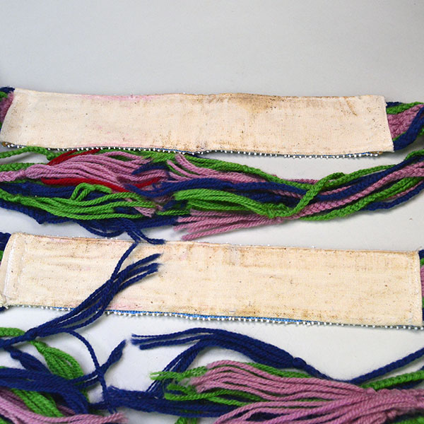 Each garter measures approximately 12 inches long and 2.25 inches wide. The colorful geometric design incorporates blue, red, trans yellow, light blue, green seed beads set against a white beaded background. The crafter covered the back with canvas fabric. Each yarn tassel measures 14 inches long, adding movement and color to the finished pieces.