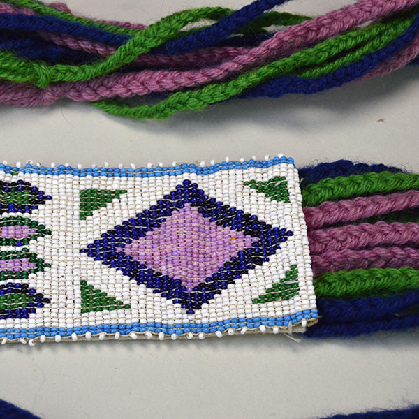 These Garters- Loomwork Panel beaded feature a vibrant loomwork panel accented with Blue, Green, and Rose yarn tassels. The crafter braided each tassel and attached them after completing the panel.