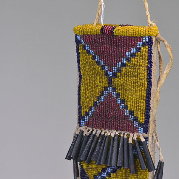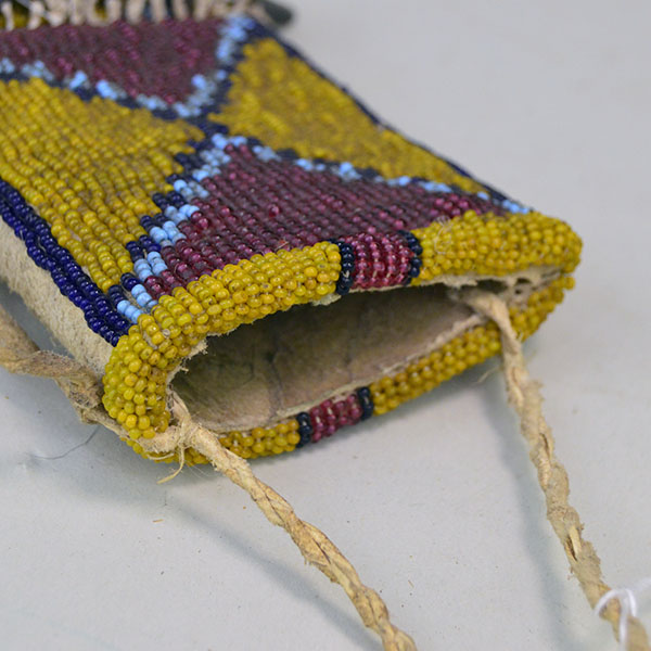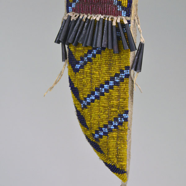 The sheath measures 10.25 inches long by 3 inches wide. The knife opening at the top measures 2 inches . This beaded Northern Plains Style Knife Sheath- Greasy Yellow is a perfect Native American regalia accessory and a valuable addition to any Native American beadwork collection.
