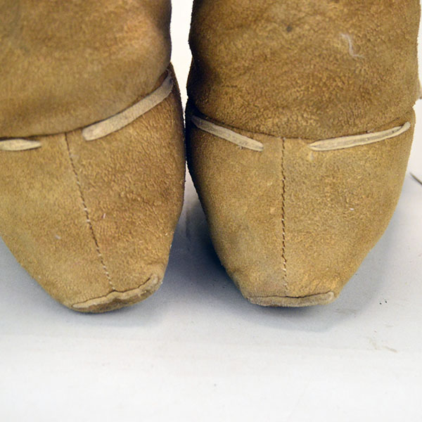 These Moccasin- Cree Center Seam are high top style. The crafter made them from Braintanned moosehide leather. The artisan machine and hand-stitched these moccasins. They have a soft sole for comfort and flexibility, making them ideal for ceremonial or display use. The high-top cuff is outlined with trans purple, trans red, trans amber, trans green, and clear seed beads.