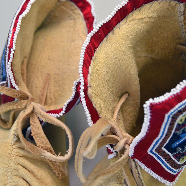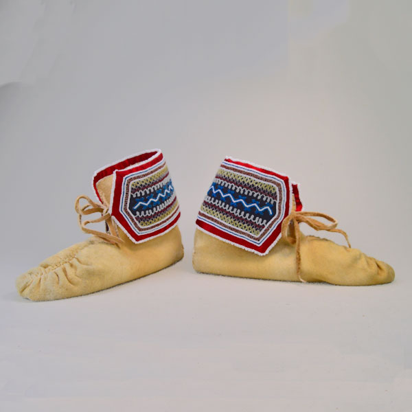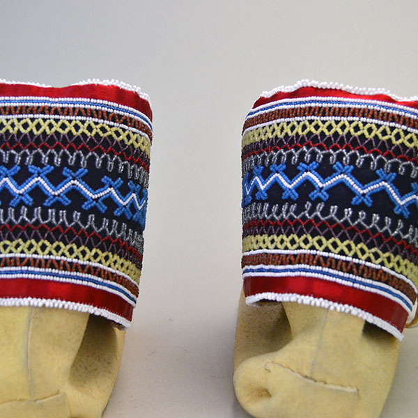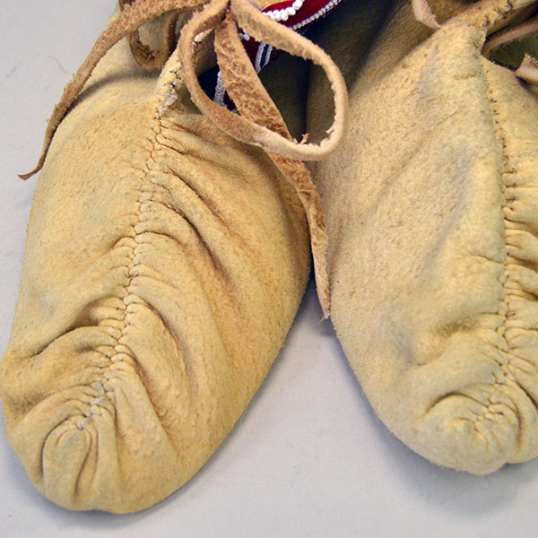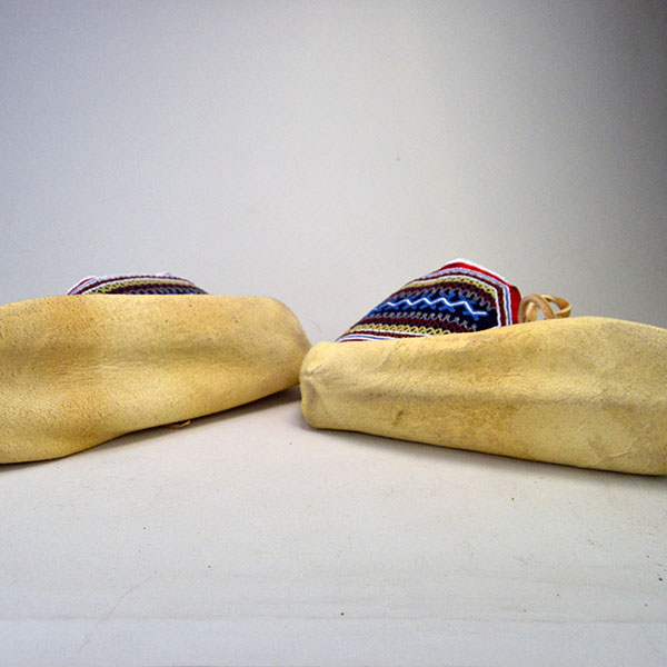 These Seneca‑style Moccasins- Braintan Center Seam—showcase classic Seneca construction, made entirely from smoked Braintanned Deerskin. The artisan combined machine stitching with hand‑sewn work to give the moccasins both comfort and flexibility. A beadwork design wraps fully around the cuffs. The crafter used white, red, transparent purple, clear, light blue, yellow, and white‑center red seed beads on a wool backing trimmed with red silk ribbon. Then the crafter added three dimensional edge beading in White Seed Beads all around the cuffs. Unlined and supple, these moccasins offer a natural feel.
