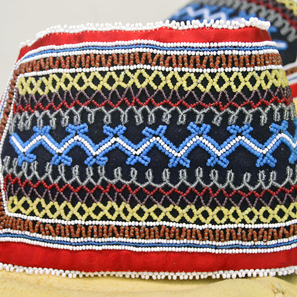 The beaded cuffs add character, and although they have been worn, they remain in good condition with plenty of life left. They measure approximately 10.5 inches long, 4 inches wide at the broadest point, and the cuffs stand 4.5 inches tall. Truly one of a kind.