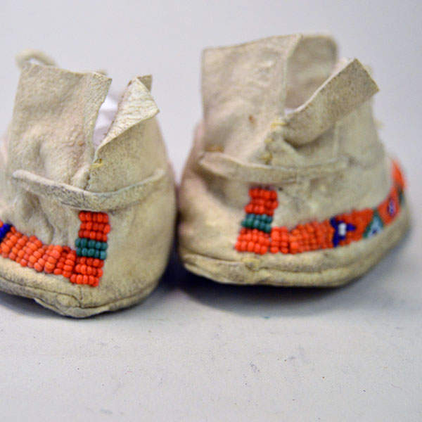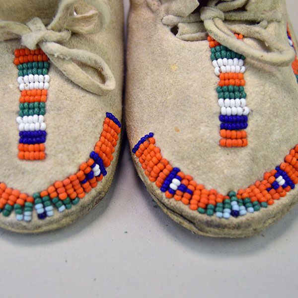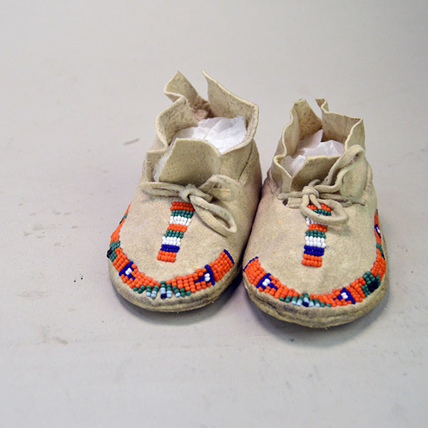 You will love these tiny Moccasins- Infant Beaded Orange! The crafter made them with Braintanned Deerskin Leather and added Rawhide soles. They added beaded bands on the vamp and the sides extending from the front to the heel with Orange, White, Green, Navy Blue and Light Blue Seed Beads. They come with a high cuff and Deerskin Leather Lacing ties.