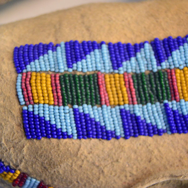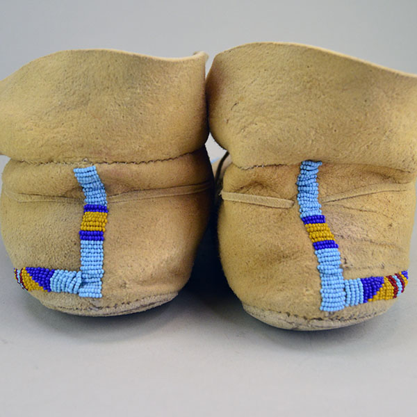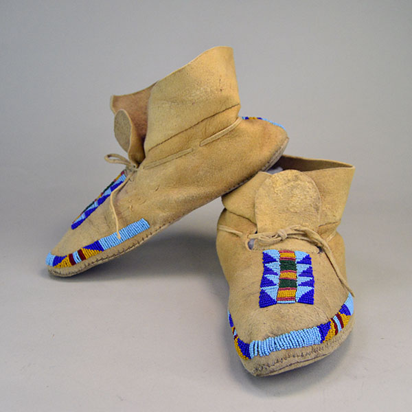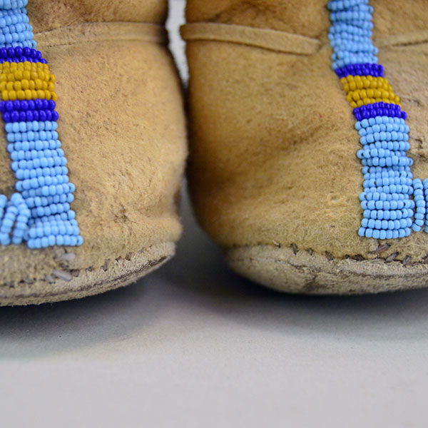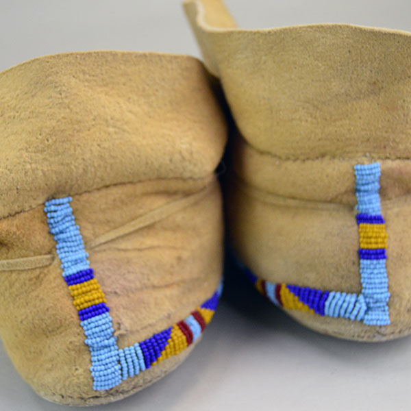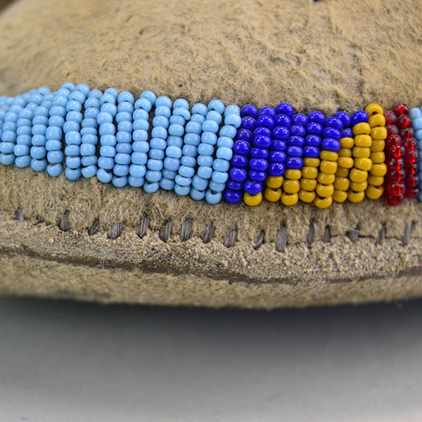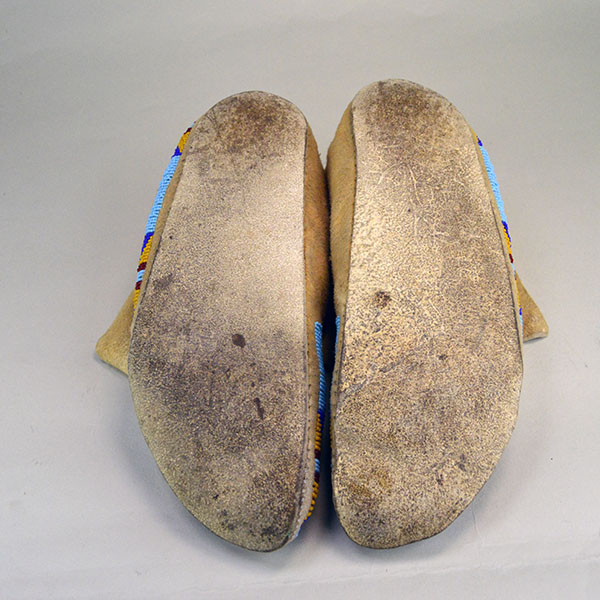 These Northern Plains moccasins are beautifully crafted from soft, durable braintanned leather and feature a partially beaded design on the vamp and around the toe. They are decorated with blue, greasy yellow, transparent red, green, and pink seed beads, creating a vibrant and traditional look.