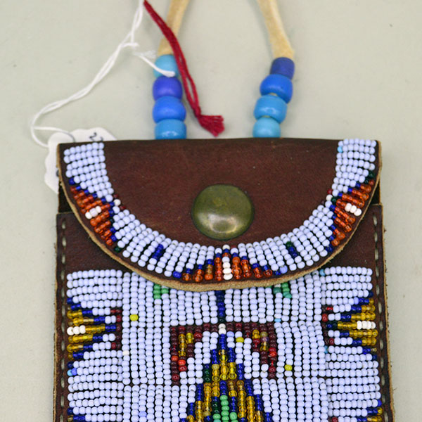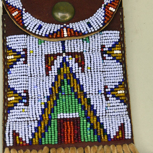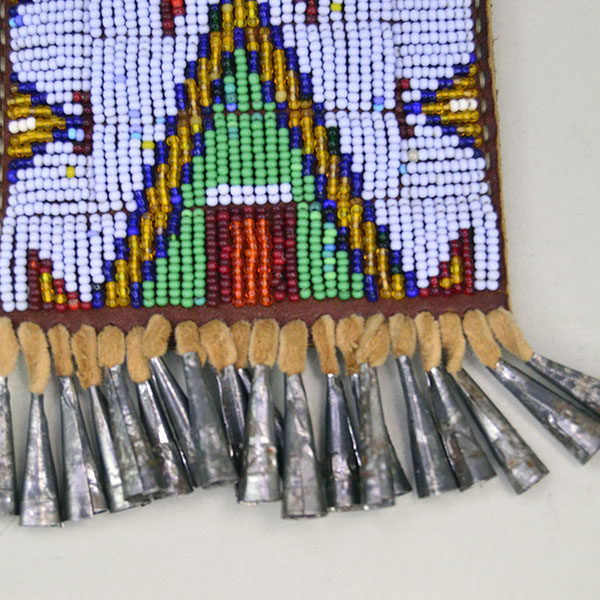 Add this fully beaded Strike-a-Lite Bag Crow Blue to your collection. The crafter began with saddle color strap leather and hand-stitched a Tipi beadwork design across the front. They used brain-tanned deerskin lacing for neck strap, and added Blue Crow Beads. Drops made with tin cones and Braintanned leather lacing. The neck strap features Blue Crow beads.