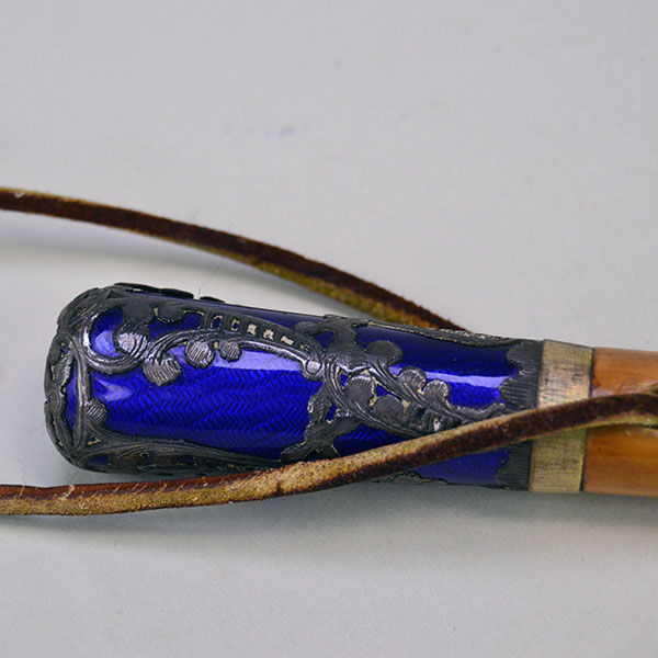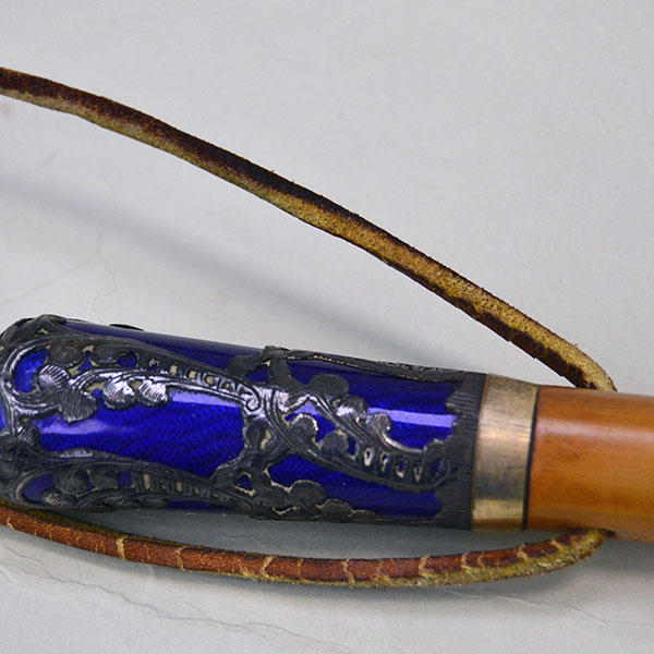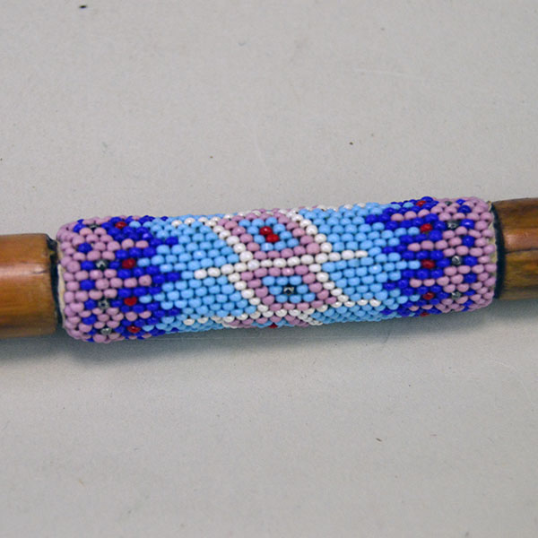 Use this 24.5″ Dance Tail Stick – Umbrella Handle at your next Powwow or display it in your home! The crafter started with a bamboo umbrella handle to which he added one section of beadwork. To create the beaded section, he used 13/0 cut seed beads in Cheyenne Pink, Cobalt Blue, Light Blue, White and Metallic Silver. The beaded section measures approximately 2.25″ long. The crafter added a silver metal thimble to one end. For the handle he fitted the piece with a cobalt blue umbrella handle decorated with an overlay of silverwork. The finished Dance Stick measures 24.5 inches long overall. You will find it in like new condition. It is ready to use or display!