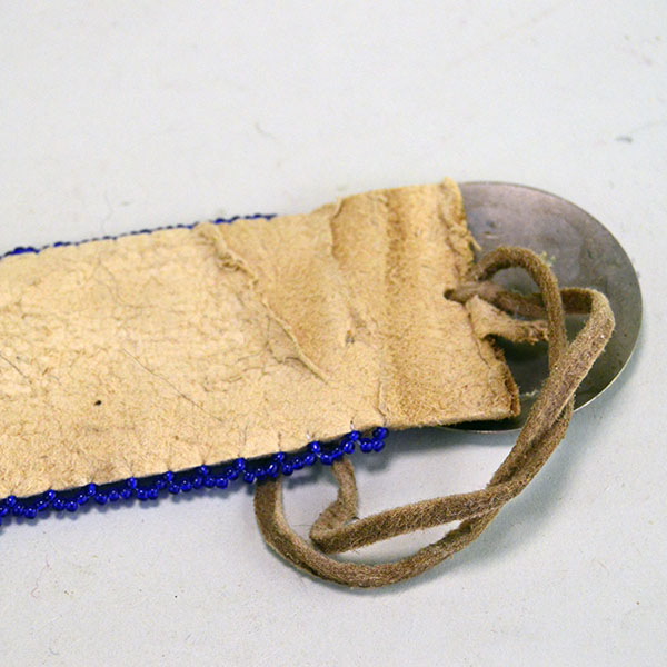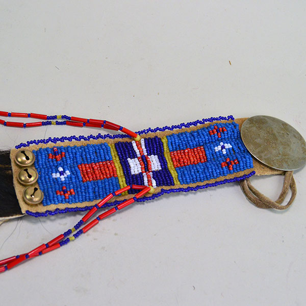 On the bottom, he attached one strip of Bear fur. He added four beaded drops made with Turquoise and Yellow Pony Beads, and White center Red tube beads. Each drop ends with a trade bead. You can tie it to your hair with the attached Deerskin Leather Lacing. The measurements are 22″ long x 2.5″ wide.