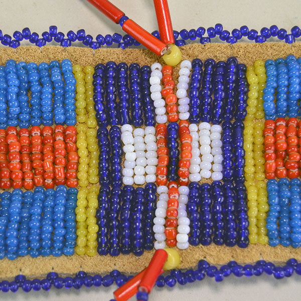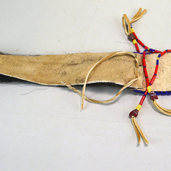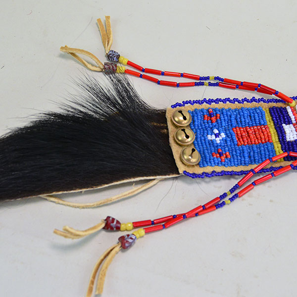 Wapegnaki is a name for a Plains Indian Hair Ornament.  These Hair Ornaments typically feature a strip of beadwork or quillwork with a length of hair coming from the bottom. Crafters adorn them with elements like horsehair, feathers, tassels, or tin cones. The designs often incorporate vibrant colors and patterns, reflecting cultural significance and artistic skill. Wapegnakis are not only decorative but also hold cultural and ceremonial importance. Pieces like this Wapegnaki are often worn as part of traditional regalia during dances or special events.