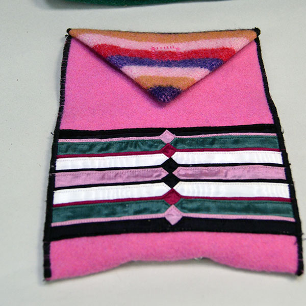 The small pink wool bag (6.5″ x 5″) rounds out the set with charm and practicality. It features a selvedge flap, decorative ribbon work and a secure Velcro closure to keep small items safe. This compact bag is perfect for jewelry, keepsakes, or everyday essentials.