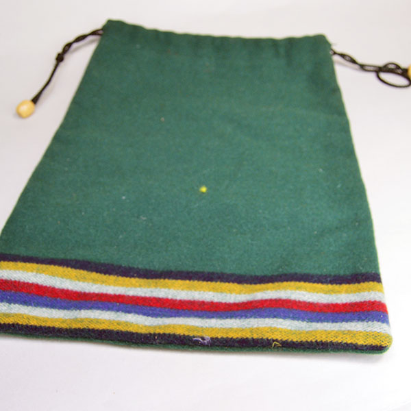 This Wool Bag Lot comes with three handmade pieces that combine durability, beauty, and everyday usefulness. The large green wool bag (15″ x 11.5″) has a selvedge edge stripe on the bottom. The drawstring closure pulls tight with smooth round wooden beads, making it a secure, ready‑to‑use carry bag.