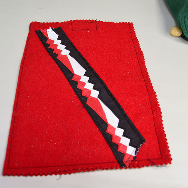 The medium red wool bag (9.5″ x 7.25″) adds visual appeal with its bold ribbon design in red, white, and black. It closes with a Velcro closure, making this bag a reliable choice for travel and storage. It’s a functional piece with eye‑catching detail.