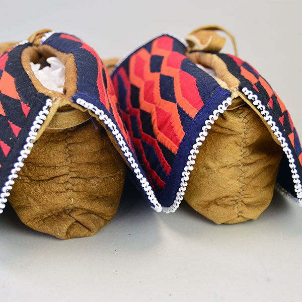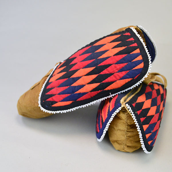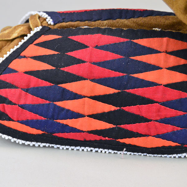 These women’s center‑seam Moccasins- Trimmed Ribbon Cuffs stand out with vibrant, multi‑color diamond pattern ribbon work. The design is unusual and beautifully executed in Navy, Black, Red and Orange ribbon. The crafter also added white seed bead edging around the cuffs. The maker used a darker colored Braintanned deerskin. The ribbon work demonstrates the skill of the crafter. The cuffs add a pleasing and noticeable pop of color to these traditionally made moccasins. Unlined and supple, they offer a natural feel. These moccasins are new and have never worn. They offer a rare chance to own craftsmanship of this quality. They’re ready to display, gift, or wear for special occasions. They measure approximately 8.5 inches long, 3.5 inches wide at the broadest point.