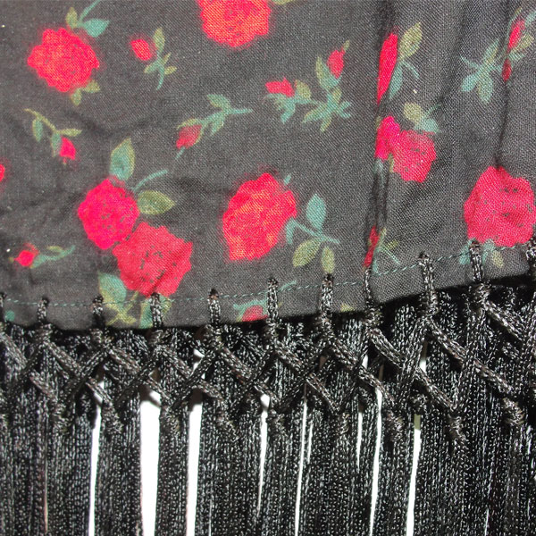 This Shawl- Black with Roses features a bright rose motif and a dramatic double‑knotted black fringe. It measures 42.5 inches wide by 51 inches long, offering a generous drape. The 12.5‑inch fringe extends the silhouette and gives the shawl a striking finish. This shawl is made from a cotton poly blend. The rich black back ground sets off the rose design beautifully, creating a piece that stands out whether worn for an event or styled as part of a collection.