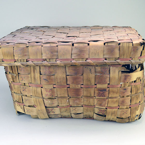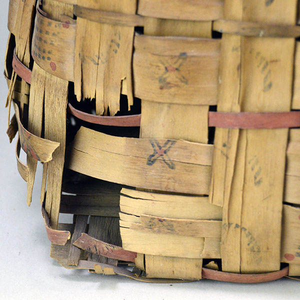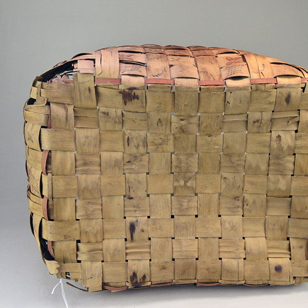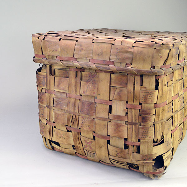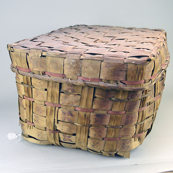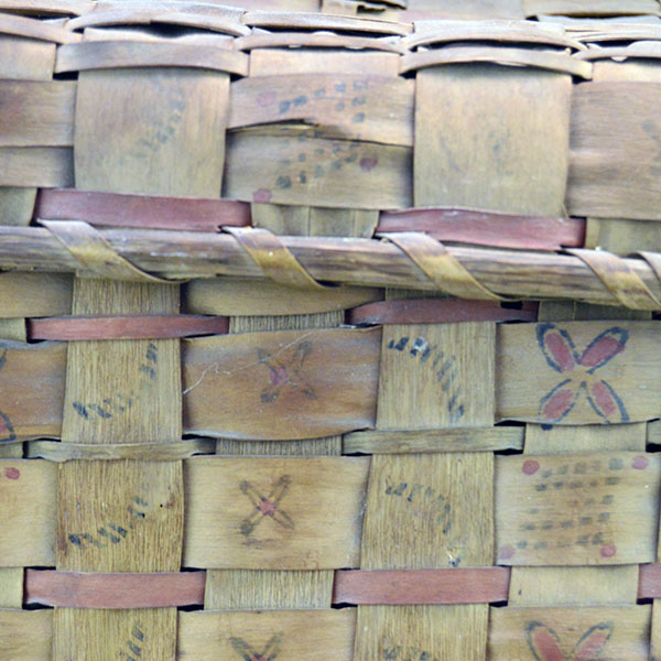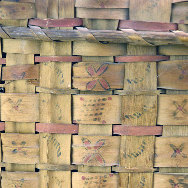 This Basket- Antique Potato Stamped makes a beautiful addition to any basket collection. The weaver added hand‑stamped designs in several areas, along with a few additional decorative elements that give the piece extra charm. The maker crafted both the basket and its lid from natural ash splints. Then carved simple shapes into a cut potato, dipped them in pigment, and pressed them onto the ash splints to create the distinctive stamped patterns. Crafted in the early 1900s, the basket is well used, with broken splints on both the cover and the basket itself. The stamping is outstanding for its age, showing crisp, well‑defined impressions that immediately draw the eye. The basket carries strong character and displays beautifully, even with its age‑appropriate wear. It remains a solid, desirable display piece that adds authenticity, charm, and collector value to any setting. The basket stands 11 inches high with the lid on and offers a generous footprint at 18 inches long by 15 inches wide, giving it strong presence for display.
