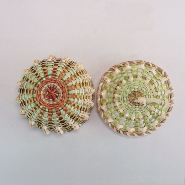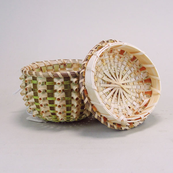 This Basket Ash Green & Brown Contemporary needs a special place in your collection! The basket maker used natural Ash splints interspersed with Brown and light Green splints. She covered the outside of the Basket with natural colored curls.  Around the edge of the lid and the top of the basket, the basket maker wove Sweetgrass strands.  The crafter wrapped a few bits of ash splints together to create a handle for the lid. This basket stands about 2.5 inches tall. The top diameter measures 3.5 inches. It is in new condition! One of a Kind!