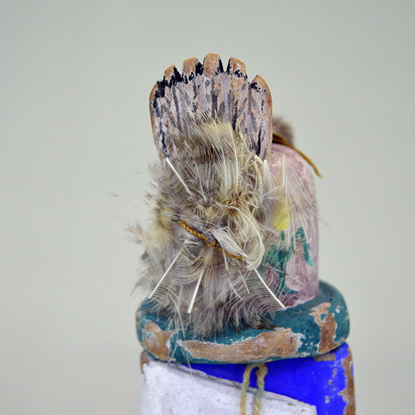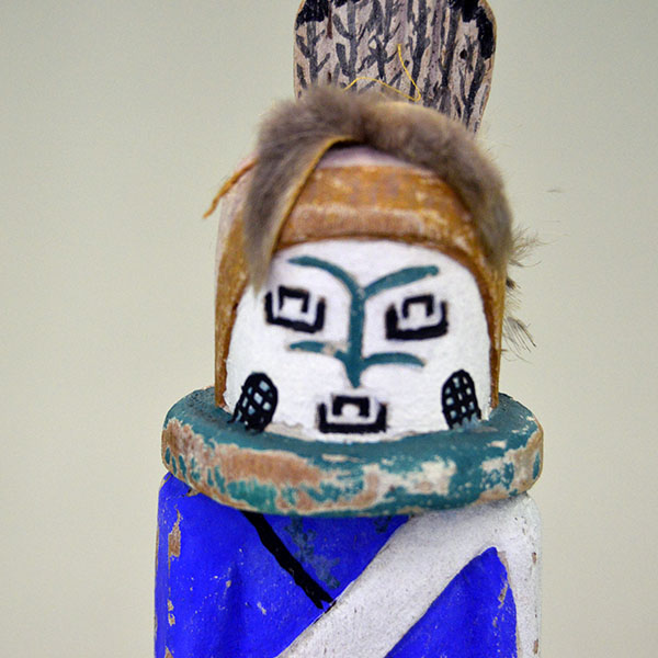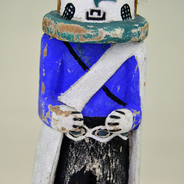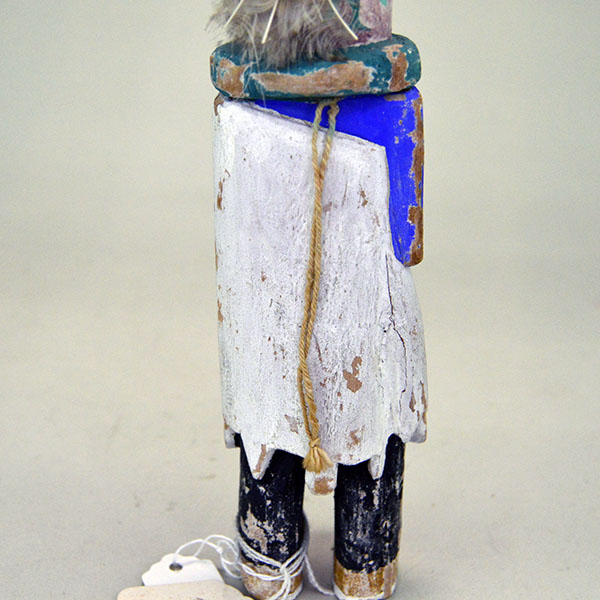 This Katsina- Rainmaker Style features a bright blue top. The artist carved it from cottonwood and painted it with tempera colors. His headpiece includes carved feathers, a bit of fur, and a bundle of real feathers on the back. He wears a white cloak over his blue top and black pants. Some of the paint has rubbed off over time, adding to its vintage character. This katsina stands 9 inches tall.Its height, detail, and classic Rainmaker presence make it an appealing addition to any Katsina collection