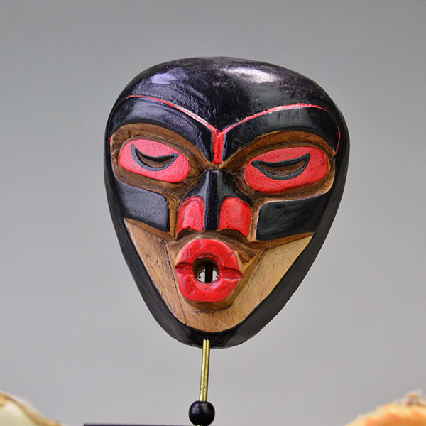 Artie George is the great nephew of Chief Dan George. Artie is a Coast Salish artist who works from the Burrard Reserve in North Vancouver, British Columbia. He is an accomplished wood mask carver. He creates miniature masks that he adds to brooches, shadow boxes and bolo ties. You can find his work in museums in the United States and Canada.