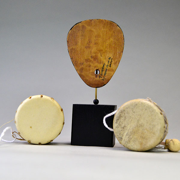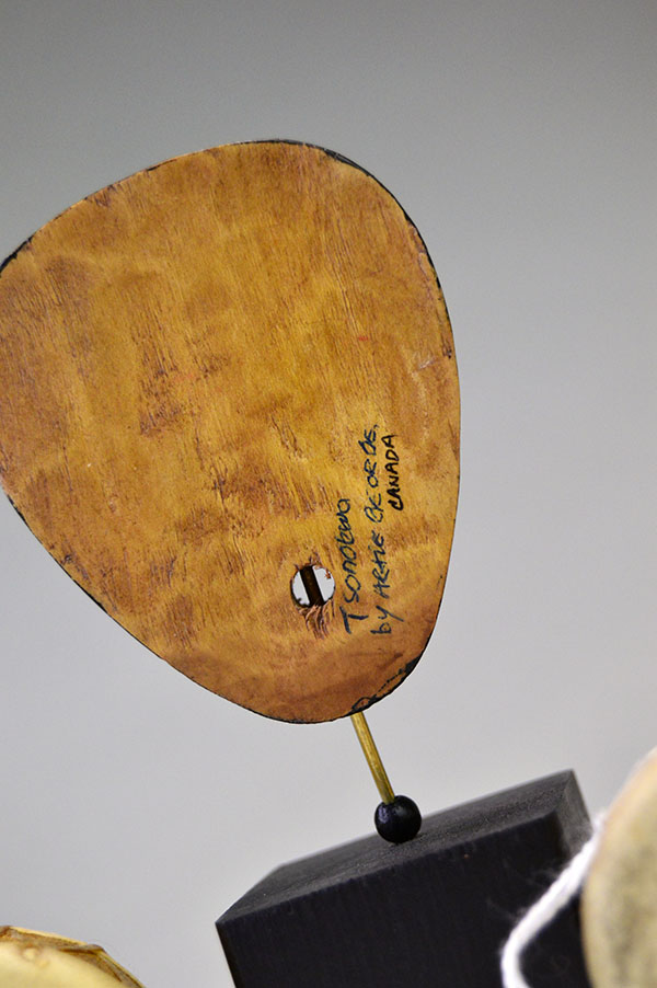 The mask itself measures 2.5 inches tall. Mounted on its black wooden block, it stands 4.75 inches high and 2 inches wide. Each miniature drum measures 1.75 inches wide by 1.25 inches tall. A “Salishon” sticker appears on the bottom, and Artie George’s signature is written on the back of the mask. One of a Kind.