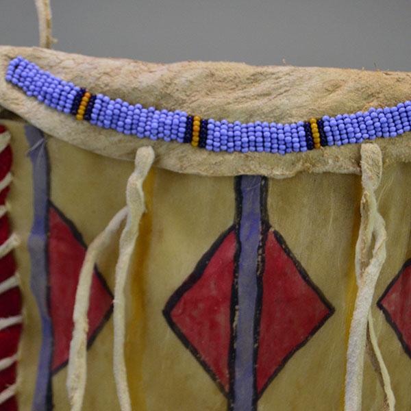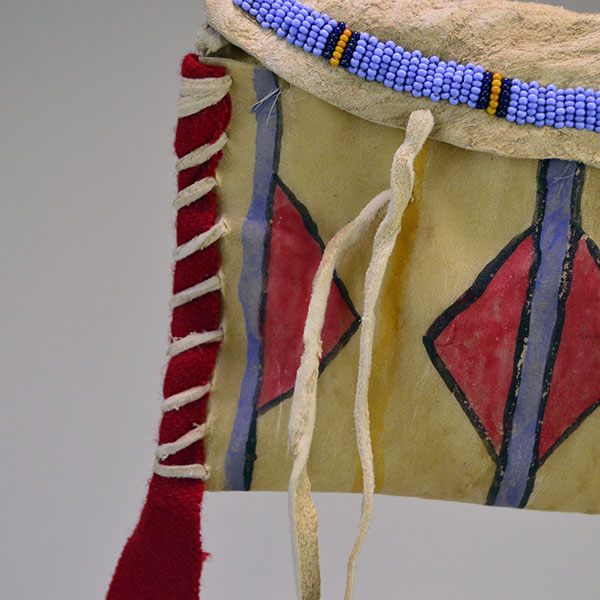 A parfleche (pronounced par‑flesh) is a traditional Native American container made from rawhide. The word comes from the French parer (“to parry or shield”) and flèche (“arrow”), referring to the way the heavy hide could deflect arrows. Rawhide also served as a durable material for shields. To create a parfleche, makers—especially those from the Great Plains region—used untanned animal hide, often buffalo, and decorated the surface with intricate geometric designs painted with natural pigments from plants and minerals. These versatile containers held food, clothing, personal belongings, and important cultural items, and they played an essential role in the mobile lifestyle of many Plains communities, as people could easily carry them on horseback during travel and hunting expeditions.