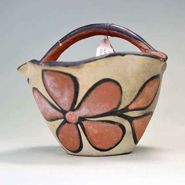 This Santa Domingo pottery bowl will make a fine addition to your collection. The small bowl is handcrafted in a scalloped shape with a handle. The potter hand‑coiled the vase and covered it with a white slip base. They then added floral designs to the exterior in red and black slip, and finished the rim with a band of black slip. This ceremonial bowl, with its scalloped rim, is a fine example of Santa Domingo craftwork.