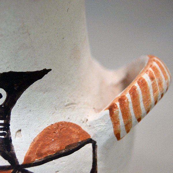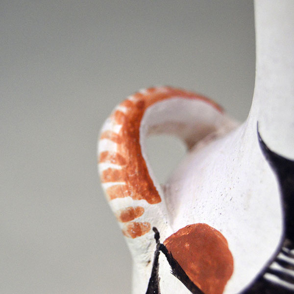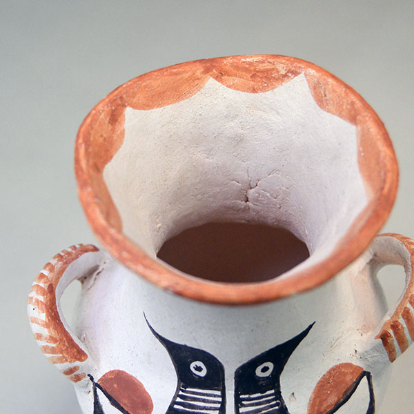 This Acoma Pottery- Signed Mabel Brown vase features a double Thunderbird design. Potter Mabel Brown hand‑coiled this vessel then applied a white slip base. She hand‑painted two striking Thunderbirds as one design in red and black. She finished the piece with a red‑slipped fluted rim. On the side she added two handles, giving the vase extra presence and collectible appeal. The vase measures 5.25 inches tall and 4.5 inches wide. The base is signed “Acoma N.M. – M Brown,” confirming its authenticity and origin. This piece displays beautifully on its own, and it also works perfectly as a dry‑floral showcase for those who want to style it with seasonal stems or desert botanicals.