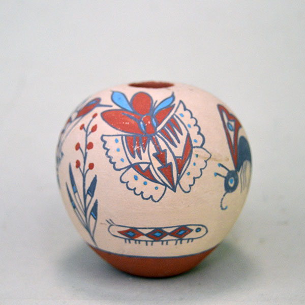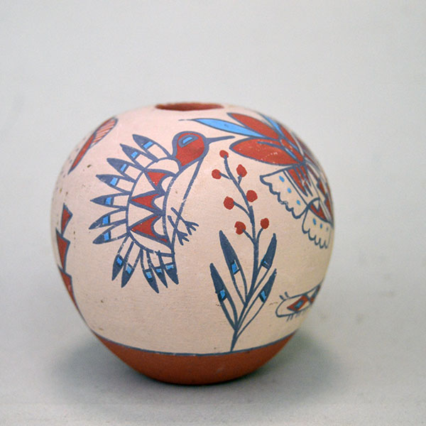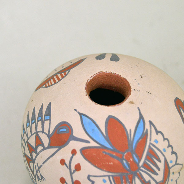This Pottery- Small Seed Jar showcases beautifully painted designs including a hummingbird, roadrunner, butterfly, caterpillar, flying insect, flower, and rain cloud. Renowned artist Rose Sandia of Jemez Pueblo, NM, signed the bottom, adding collectible value. Traditionally used to protect next year’s seeds from rodents and insects, seed jars remain prized for their form and symbolism. This jar stands 3.5 inches tall, with a 0.5‑inch opening and a 3.5‑inch base. It’s a striking, display‑ready piece that blends tradition, artistry, and Southwest charm.