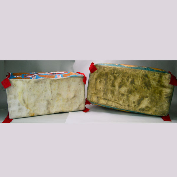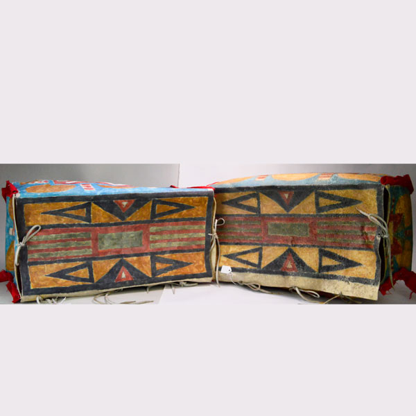 This Rawhide Containers Set of 2 are a near matched pair. The crafter pieced together Rawhide with Deerskin Leather Lacing to make the containers. He added strips of Red Wool to each corner. The containers feature nearly identical painted geometric designs. The crafter painted them with Blue, Red, Gold, Green, Black and White pigment paints on the top and sides. Deerskin Leather Lacing serve as closure ties for the top.