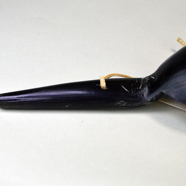 This large cow horn spoon showcases impressive craftsmanship. The crafter made it from natural cow horn. The spoon section measures 7.75 inches long by 3.75 inches wide. The handle extends 5 inches and comes with a drilled hole. The piece of leather lacing threaded through the holes allows you to hang the spoon for display or storage. Both functional and decorative, this piece embodies tradition while offering practical design. We got this Spoon from a collection. You will find it in very good condition.