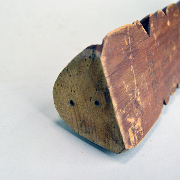 Add this delightful 12-inch cedar Totem Pole- Northwest Coast Style to your collection! Expertly carved from a single piece of cedar wood, this Totem Pole features five animals including depictions of a bird, a wolf with a fish and a bear. The artist did not paint this item, but gave it a light coating of stain or polyurethane. This miniature totem pole comes from a private collection. You will see areas that have chipped off and other scratches. There are words stamped on the back. We estimate the crafter made this pole between 1970-1980.