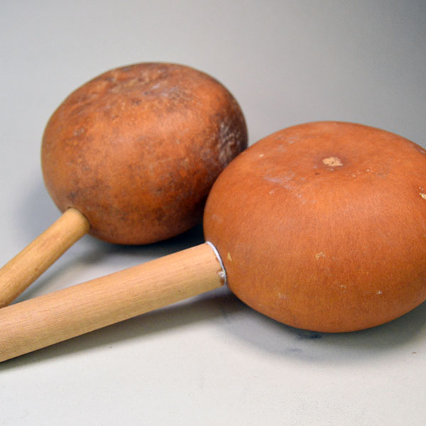 Add this set of two plain unpainted Rattle- Gourds to your collection and make them truly your own. One features a sturdy cottonwood handle, the other a wooden dowel handle. The naturally formed gourd body delivers great sound and presence. One gourd measures about 6 inches in diameter, and the other measures 6.5 inches, giving you a well‑balanced pair ready for display or use. You can easily personalize these rattles by painting your own design on the gourd and adding your own decorative elements. We are selling them as a set.